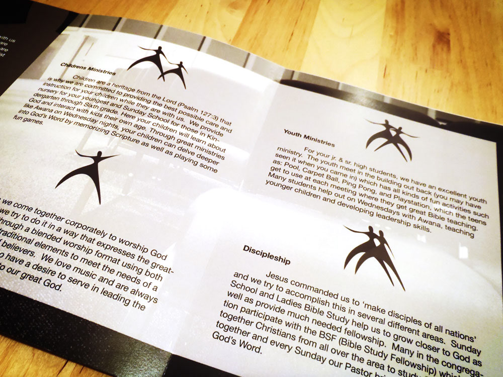 Trifold design welcome book for Bible Baptist Church. The goal was simple, to highlight different ministries within the church for new visitors.